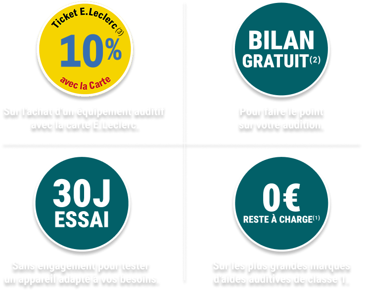 (1)Valable sur les aides auditives de classe 1 sous réserve de posséder un contrat responsable. (2)Bilan non médical. (3)Pour les porteurs de la carte E.Leclerc, valable dès le lendemain.